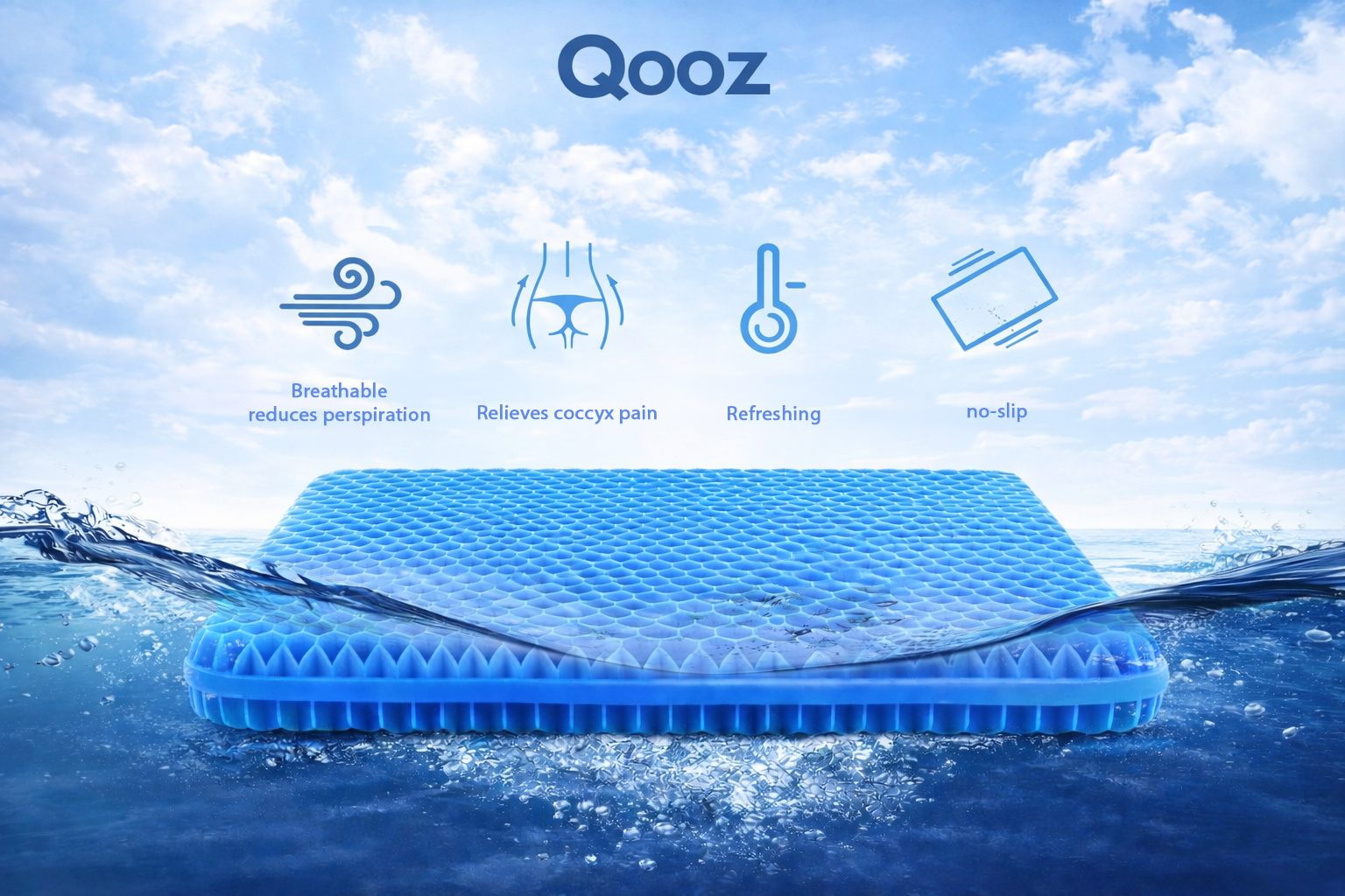 Qooz was designed with a single aim in mind: to make sitting more comfortable over long periods. Its gel structure distributes pressure more evenly whilst retaining its shape, preventing it from flattening. The ventilation channels promote air circulation and help reduce heat build-up, whilst its ergonomic shape encourages a natural sitting posture on different types of chairs.